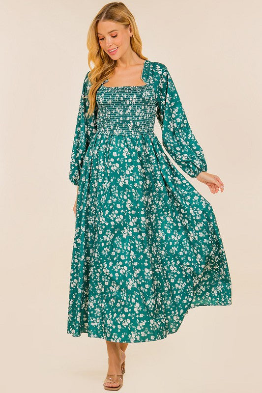 FLORAL PRINT LONG SLEEVE SQUARE NECK RUFFLE DRESS